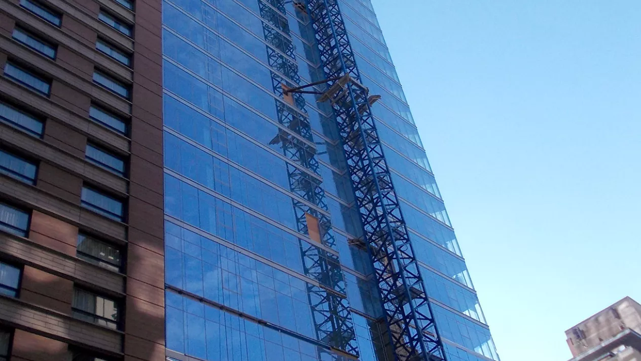 The seven lower floors of the skyscraper, which are made of concrete, house a 360-space, above-ground parking lot. The upper floors are made of steel with a concrete core.